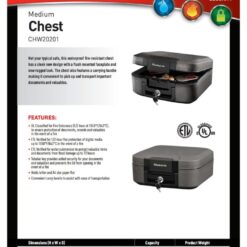 Là một trong những thương hiệu đứng Top 1 tại Hoa Kỳ, SentrySafe CHW20201 là dòng két sắt chống cháy và chống nước di động, đã vượt qua bài kiểm tra chống cháy 30 phút của UL Hoa Kỳ và bài kiểm tra bảo vệ phương tiện lưu trữ đa phương tiện của ETL. Két có kích thước bên ngoài 16,8 cm (cao) × 39,1 cm (rộng) × 36,3 cm (sâu) và kích thước bên trong 11,2 cm (cao) × 32,5 cm (rộng) × 21,6 cm (sâu), dung tích 7,93 lít, nặng 9,1 kg. Dòng két sắt SentrySafe CHW20201 được trang bị khóa chìa, phù hợp để lưu trữ tài liệu khổ A4 và vật dụng có giá trị, mang đến sự bảo vệ an toàn cho tài sản của bạn.