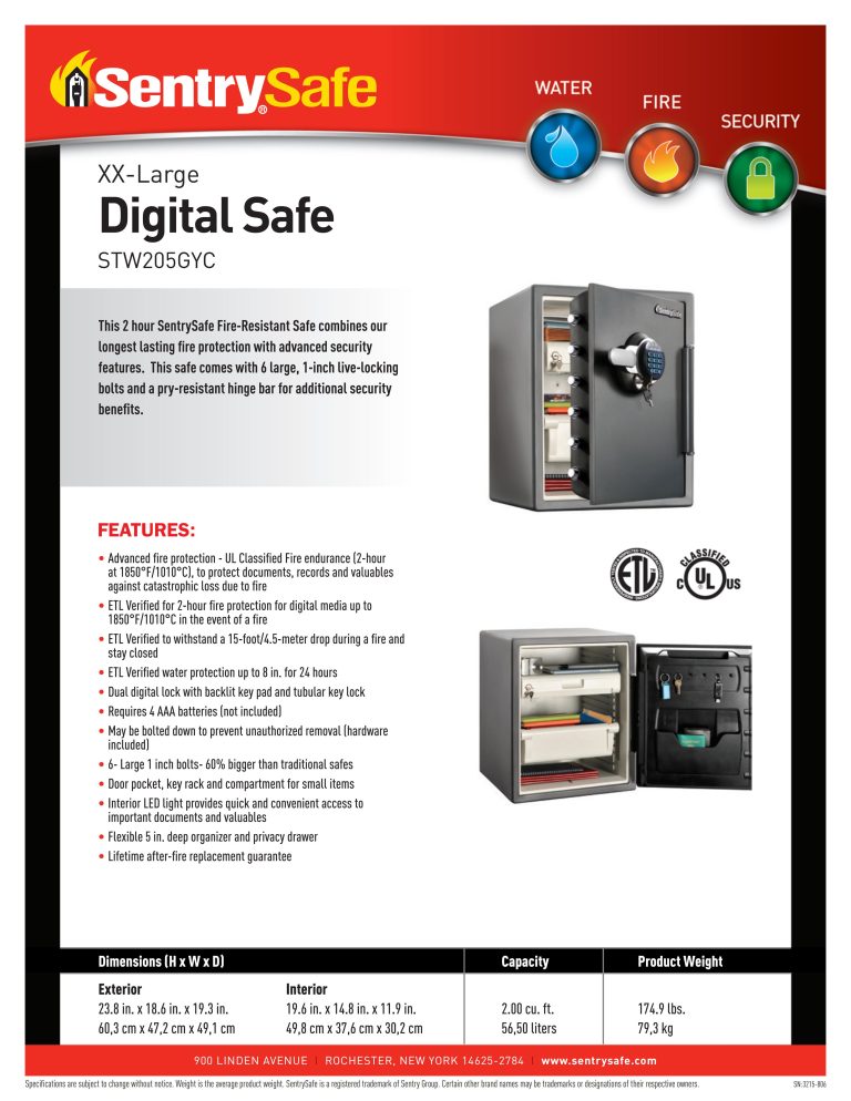 SENTRYSAFE STW205GYC là sự lựa chọn lý tưởng để bảo vệ tài sản khỏi hỏa hoạn, ngập nước và trộm cắp – một giải pháp an toàn toàn diện và đáng tin cậy.
